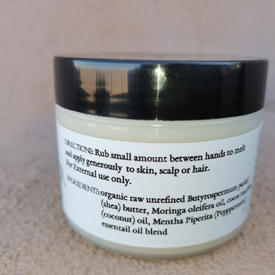 Key ingredients: Organic raw unrefined shea butter, moringa seed oil, coconut oil, peppermint essential oil blend, Vitamin E